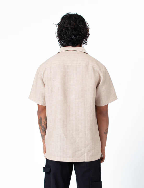 A laid-back Cuban collar shirt cut with a relaxed fit in a breathable linen–cotton blend. The linen delivers natural texture and cool comfort, while the cotton adds a soft hand and a touch of structure for everyday wear. Finished with a custom embroidery detail on the front for a subtle hit of character. Wear it open over a tee for off-duty ease, or buttoned up with chinos after dark. Comfortable, versatile, and designed to be worn untucked—an effortless warm-weather staple.