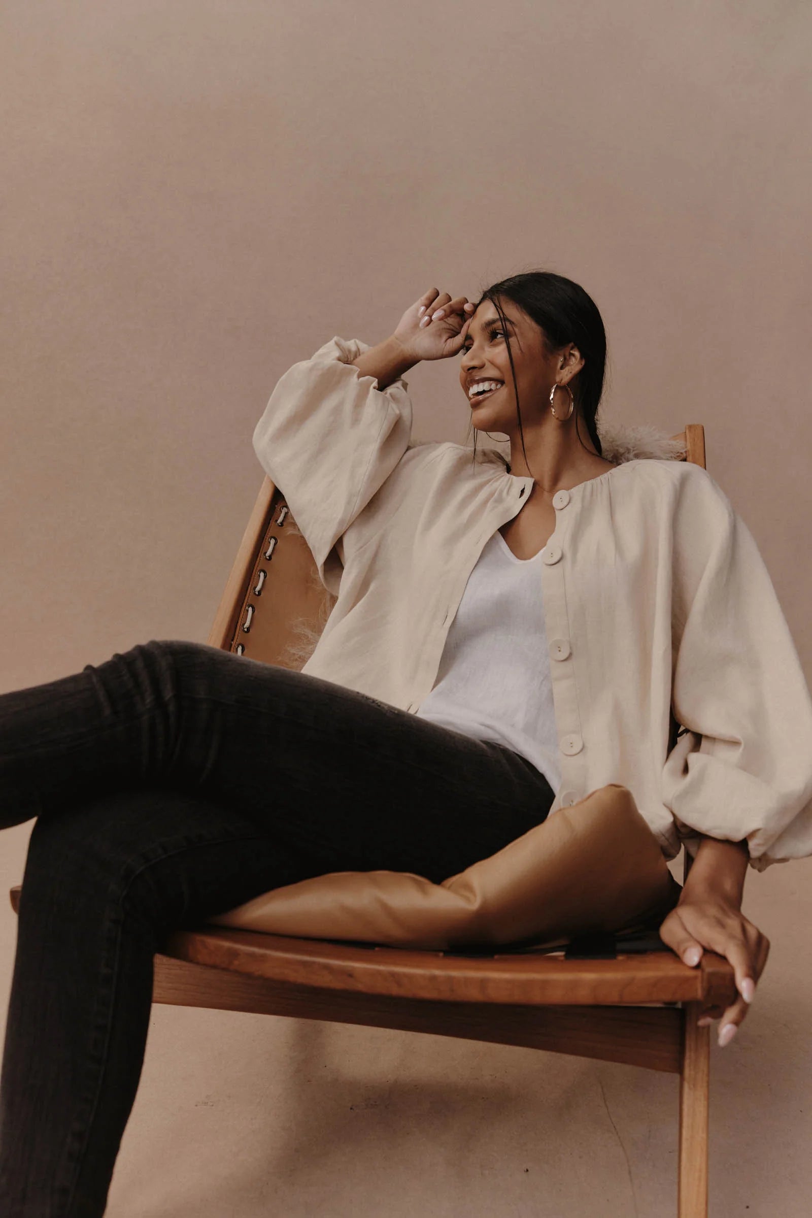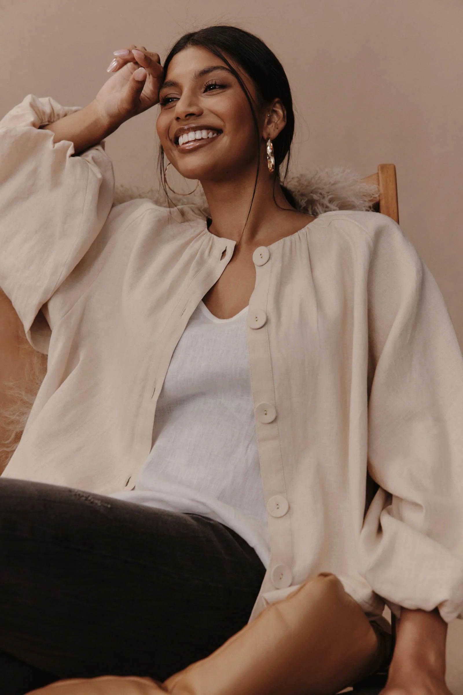 The Laax Button Blouse redefines the classic button-down with a contemporary twist. Crafted from a light linen and cotton blend, it features a collarless neckline, voluminous bishop sleeves, and a relaxed, hip-length silhouette. Wear it fully buttoned for a structured finish or leave it open over a tank top for a laid-back, undone look.