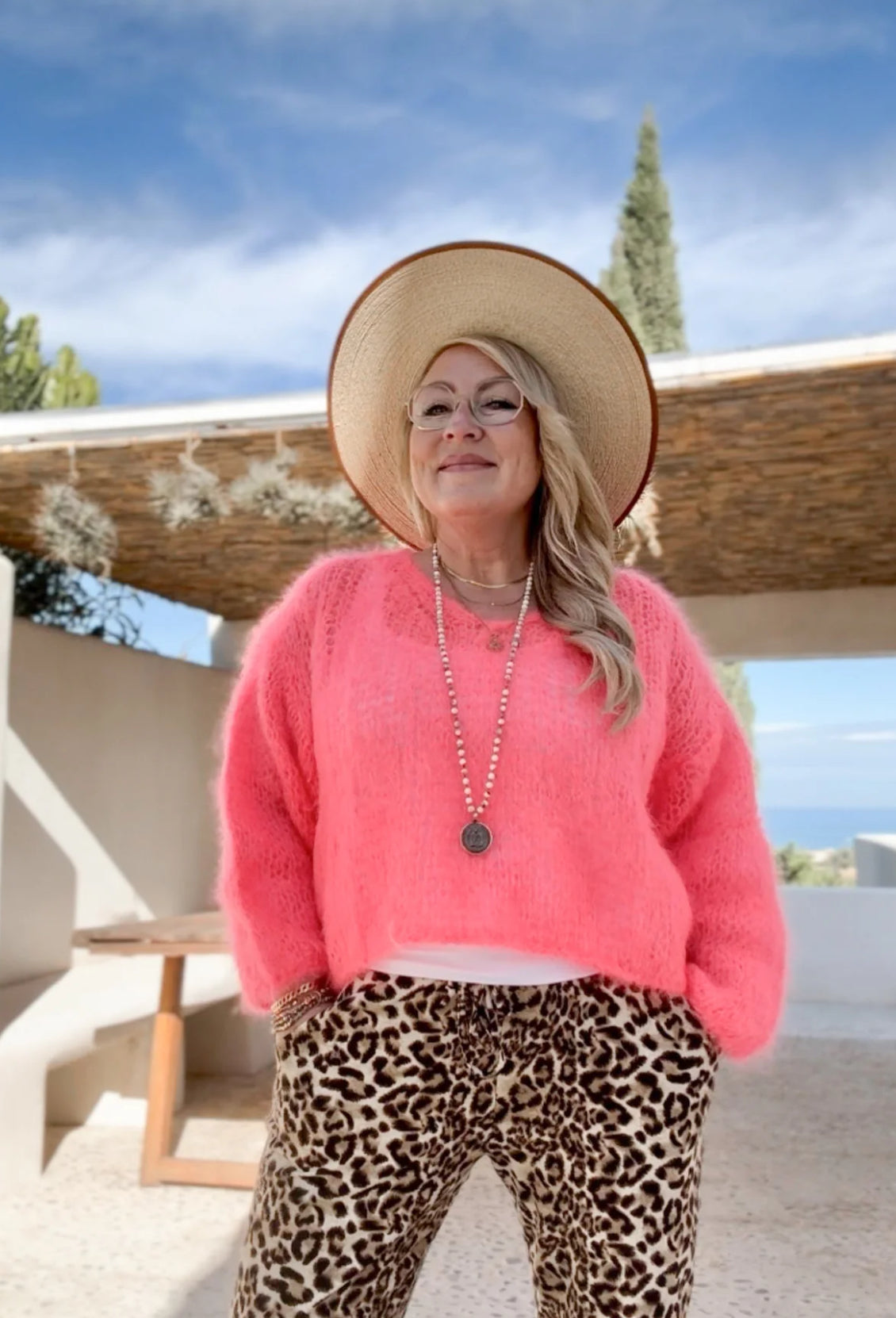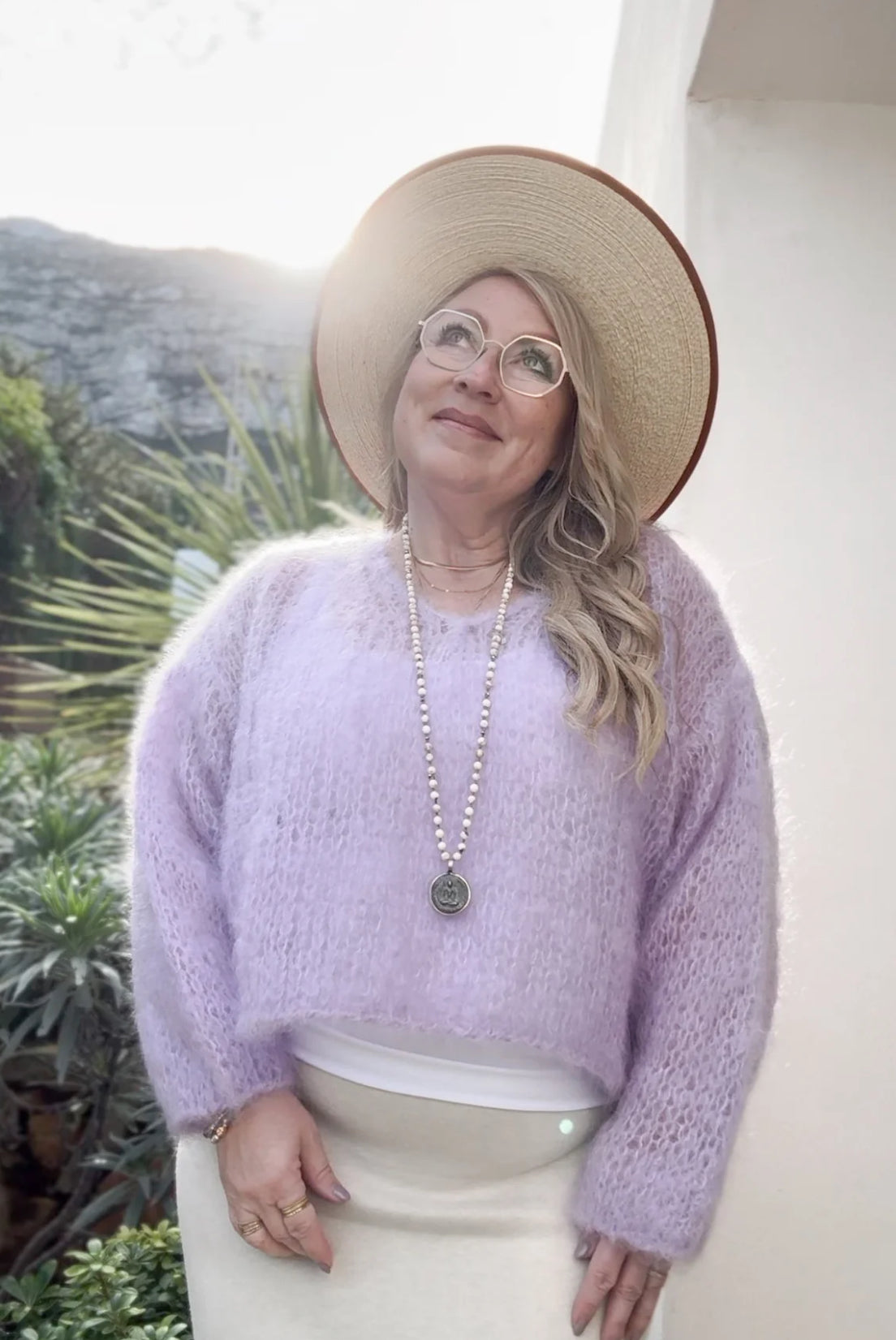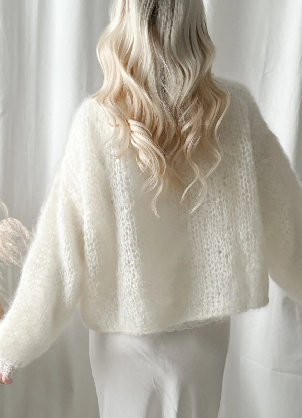 A wonderfully plush and soft kid mohair knit with a beautiful V-neck. Kid mohair's luxurious, breathable and sparse knit is like a hand-woven wonder. A short, boxy and fair design.